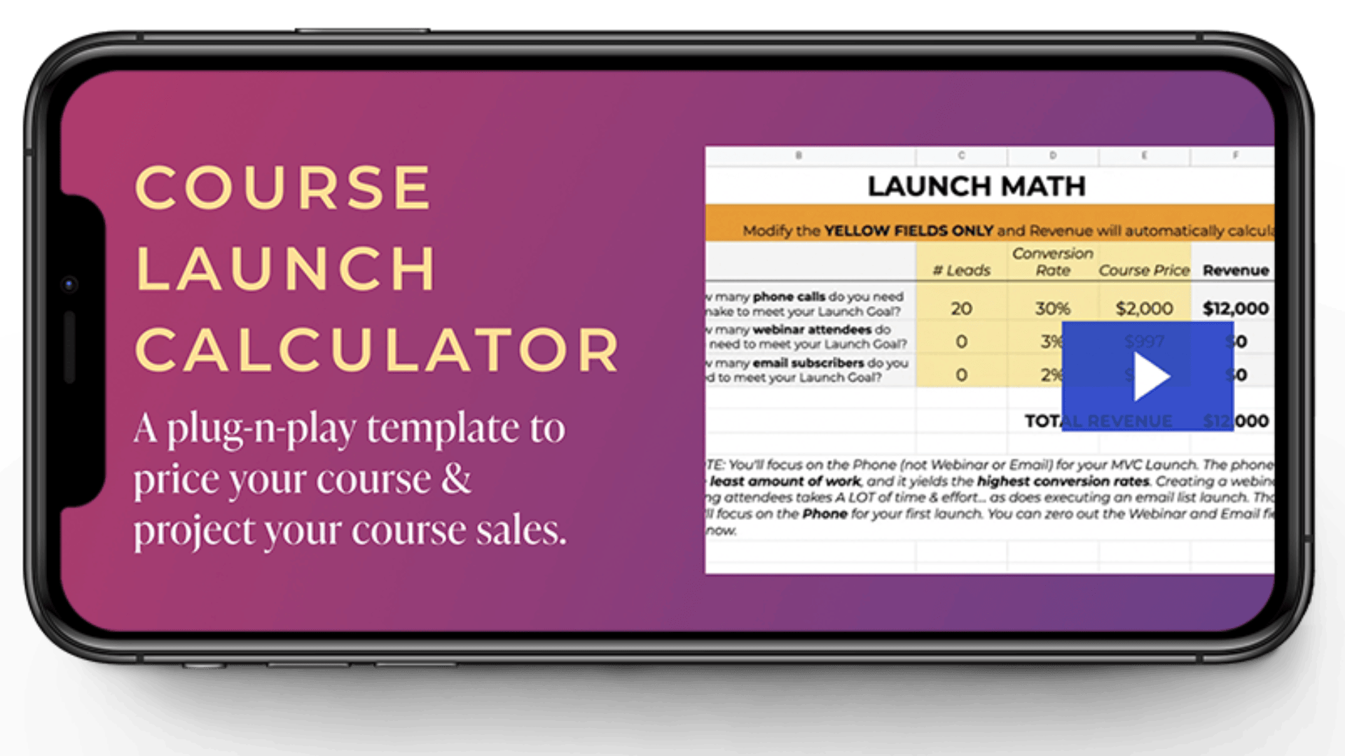 Receive my plug-n-play template to price your course & project your course sales. Learn Launch Math to plan your first $10,000 or more course launch. You'll also get a lesson inpremium pricing that will help you exceed your $10k launch goal with more certainty and scale from there.